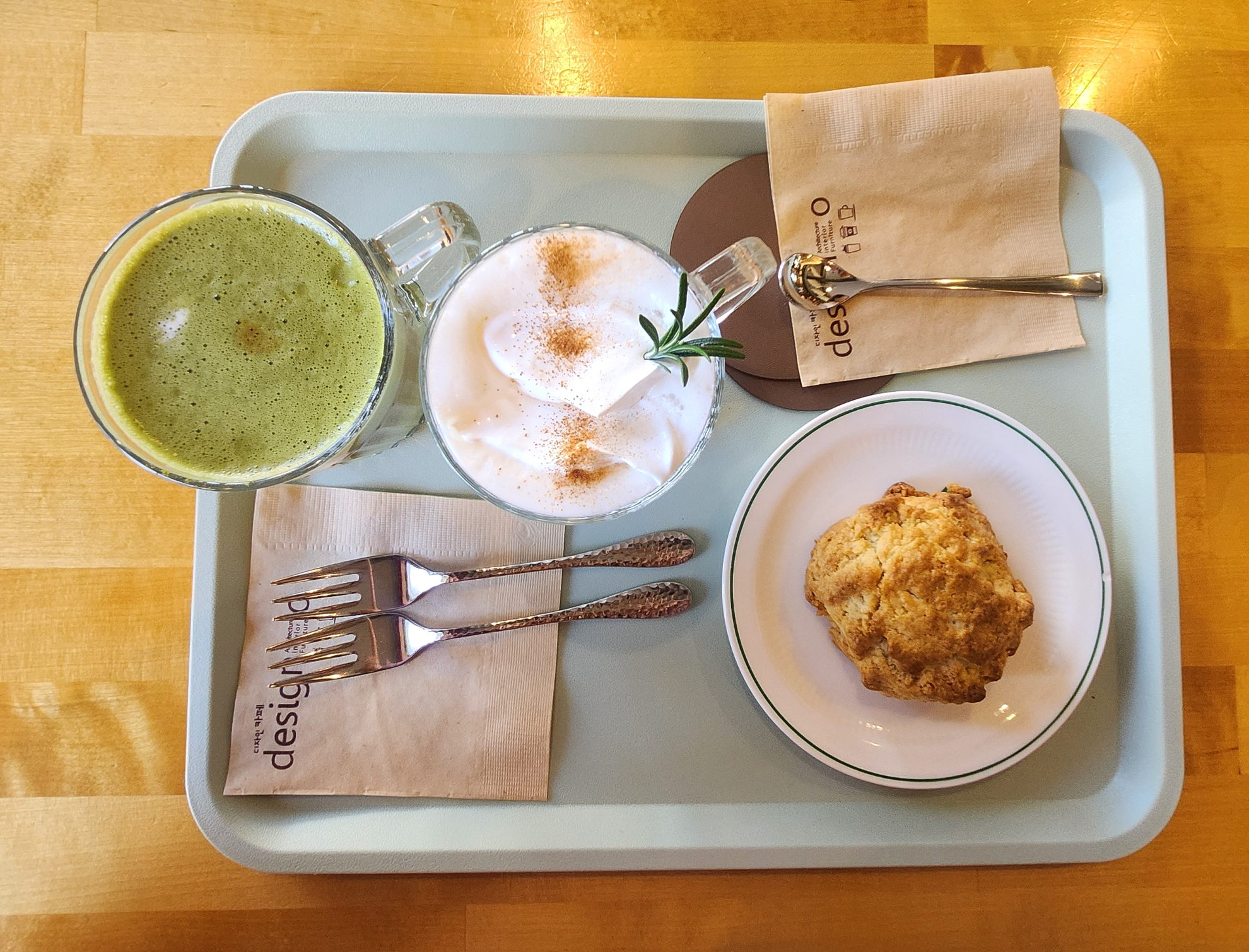 지인분은 허니진저라떼, 저는 슈렉라떼 그리고 함께 먹을 스콘 하나를 주문했어요.